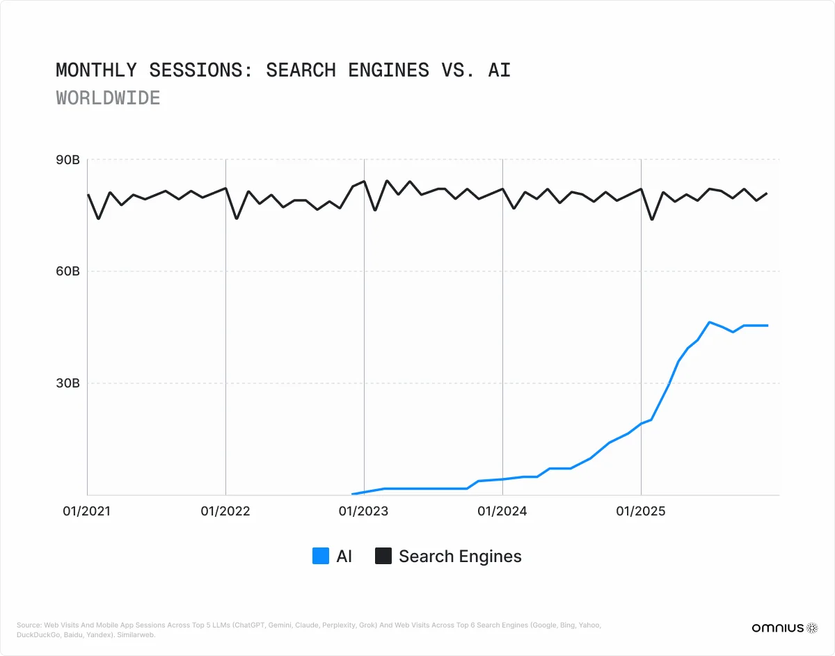 The search engine growth trend has been essentially flat for five years, hovering between 70B and 80B monthly sessions, while AI has stacked on top as a new, incremental layer. Brands that position their strategy as “AI versus Google” are asking the wrong question.